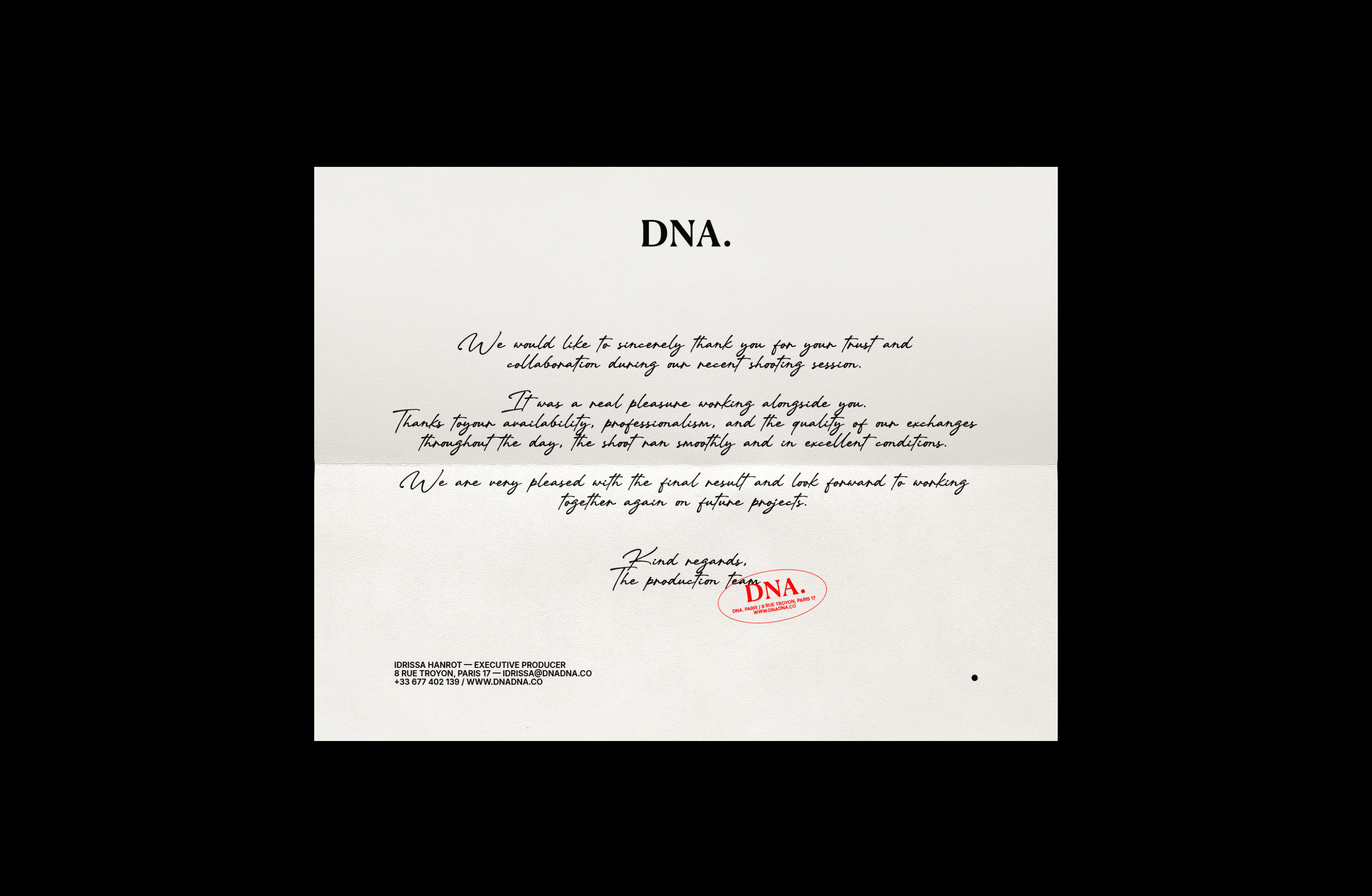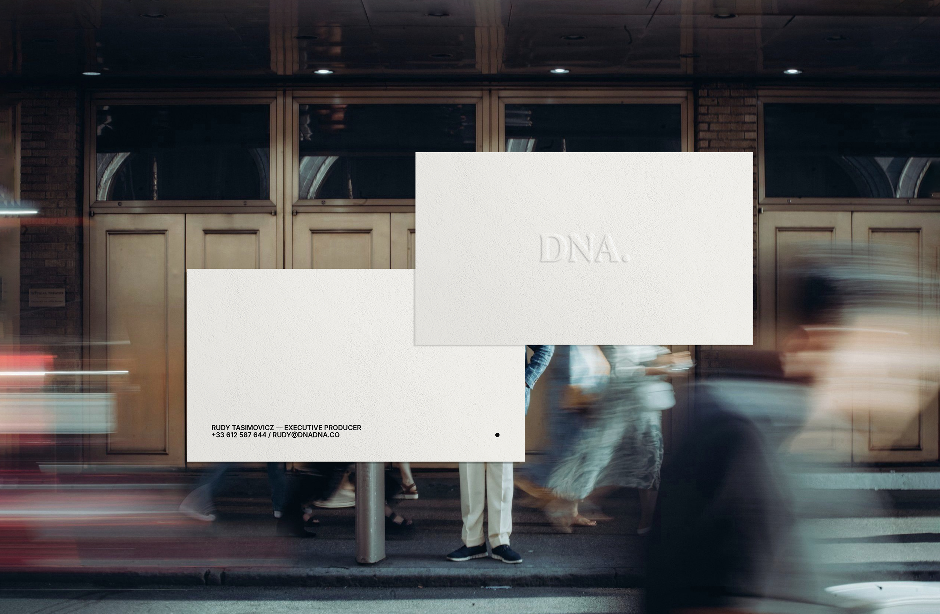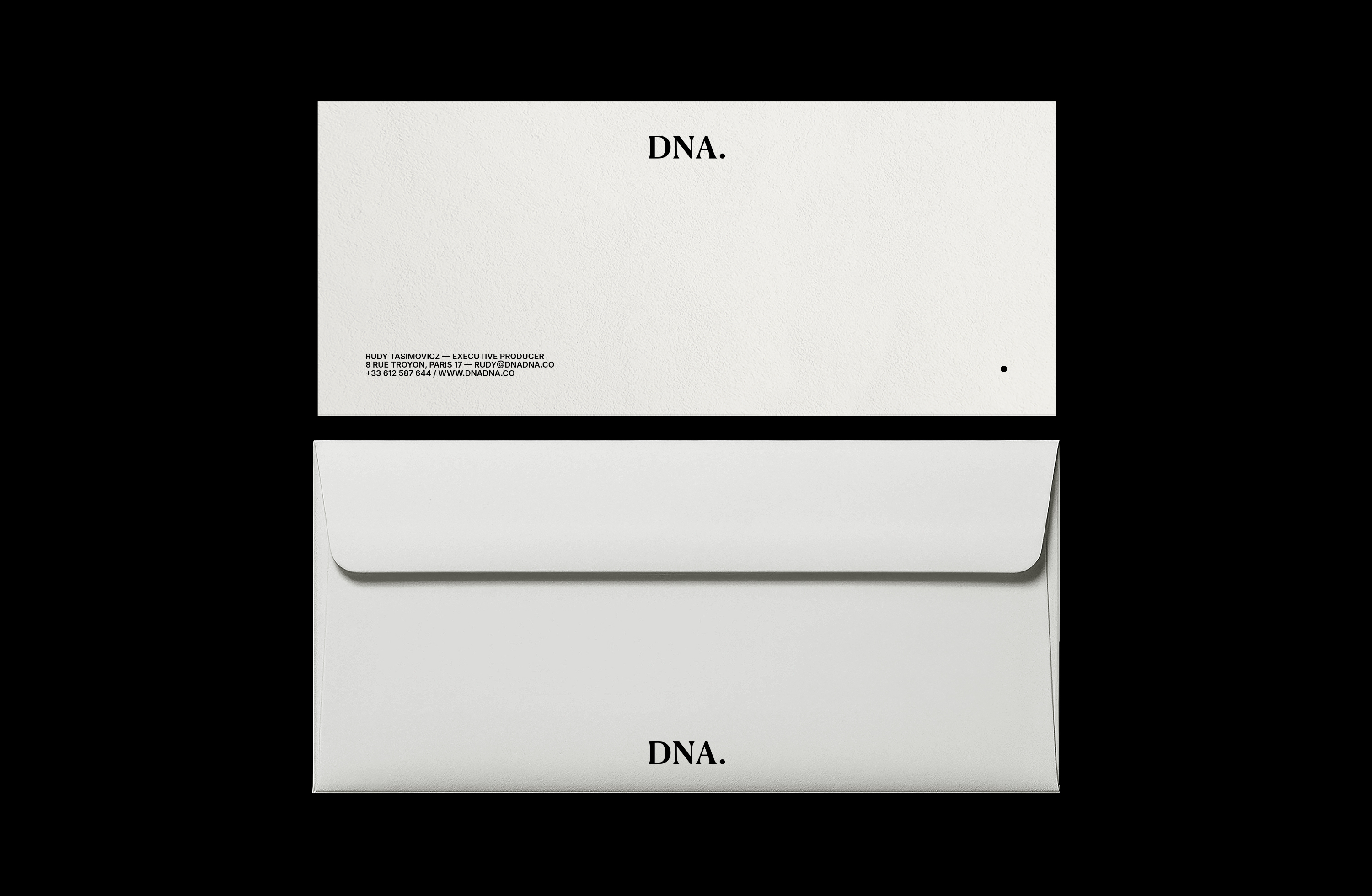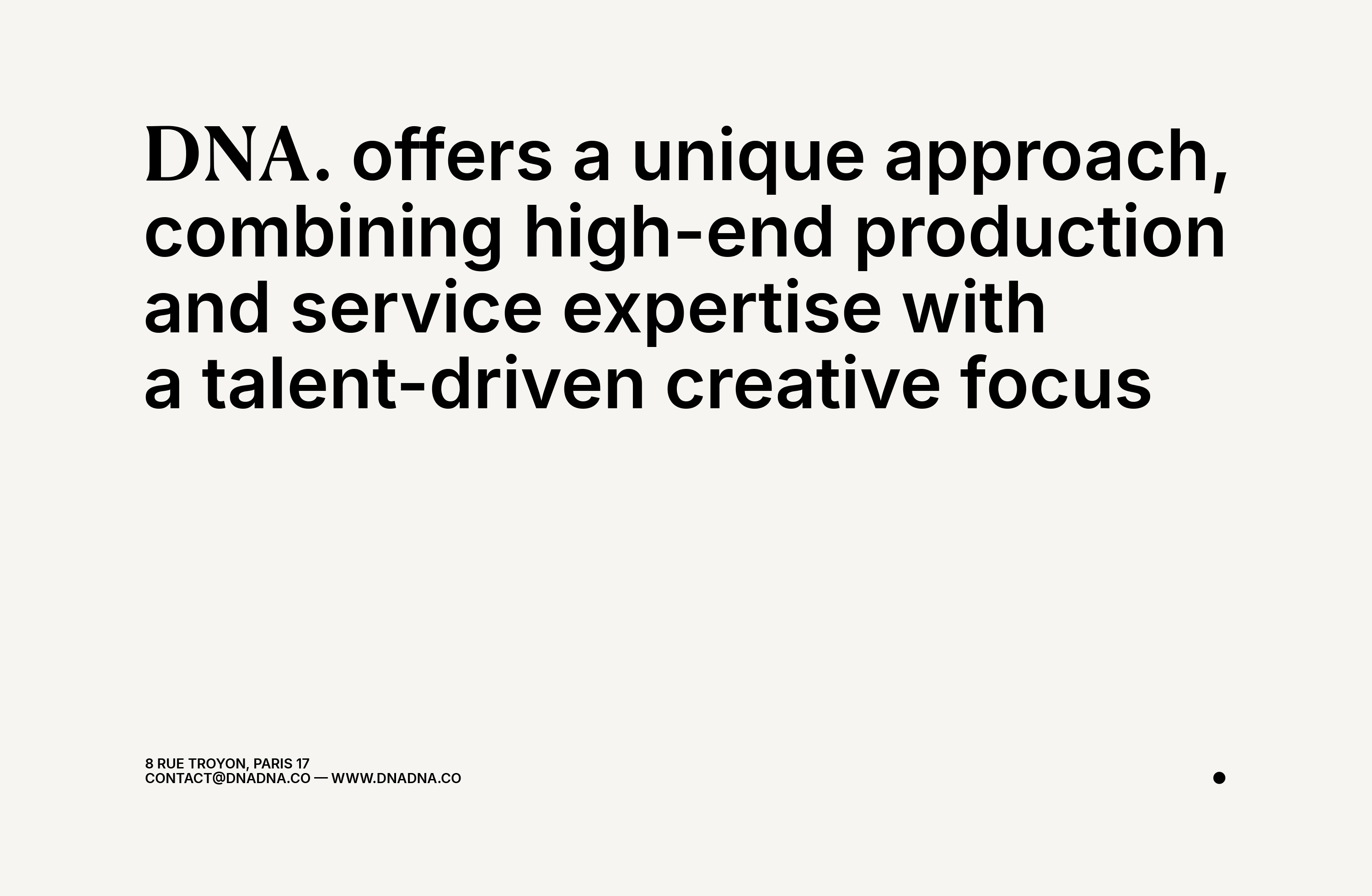 Conception de l’identité visuelle de DNA, société de production audiovisuelle. DNA. développe une approche singulière, alliant une expertise haut de gamme en matière de production et de services à une orientation créative axée sur les talents. Grâce à un modèle adaptable sur mesure pour les marques, les agences de création et les agents artistiques, DNA. peut intervenir en tant que service de production ou s'impliquer plus en amont dans le processus, par le biais de l'achat d'œuvres d'art, de présentations ou du développement créatif. Le système graphique repose sur une typographie à la fois sobre et affirmée. Le point final agit comme une signature. Il ancre la marque, affirme sa position et symbolise la maîtrise — celle d’un service premium capable d’intervenir à l’échelle internationale tout en restant impliqué au plus près du processus créatif.